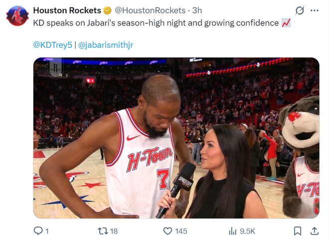 北京时间1月19日,火箭队119-110击败鹈鹕队。这场比赛是凯文-杜兰特的生涯之夜,他先是在得分端追平诺天王,随后超越诺天王升至历史得分榜第六的位置,杜兰特得分来到31561+现役仅次于詹姆斯42703+。