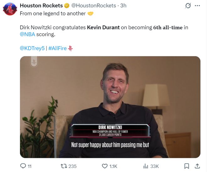 诺天王还专程为KD录制了庆祝视频,德克说道:杜兰特是篮球历史上最纯粹、最流畅的得分手之一。