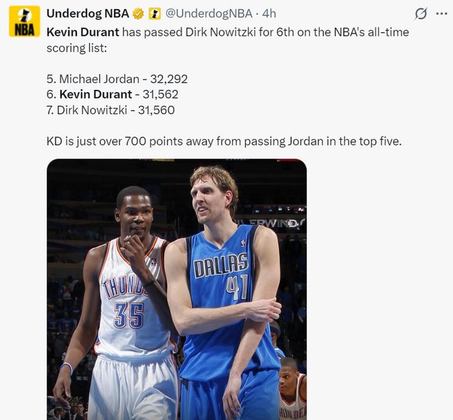 赛后杜兰特谈到自己的得分升至历史第六:这意义重大,德克是我敬仰的榜样,也是我曾对抗过的对手。我很荣幸能与这些伟大的球员并肩在得分榜单上。