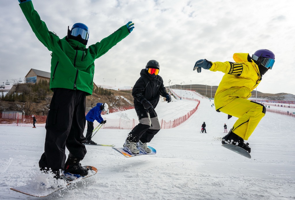 11月23日,内蒙古呼和浩特市马鬃山滑雪场,滑雪爱好者在练习滑雪360°转体技巧。