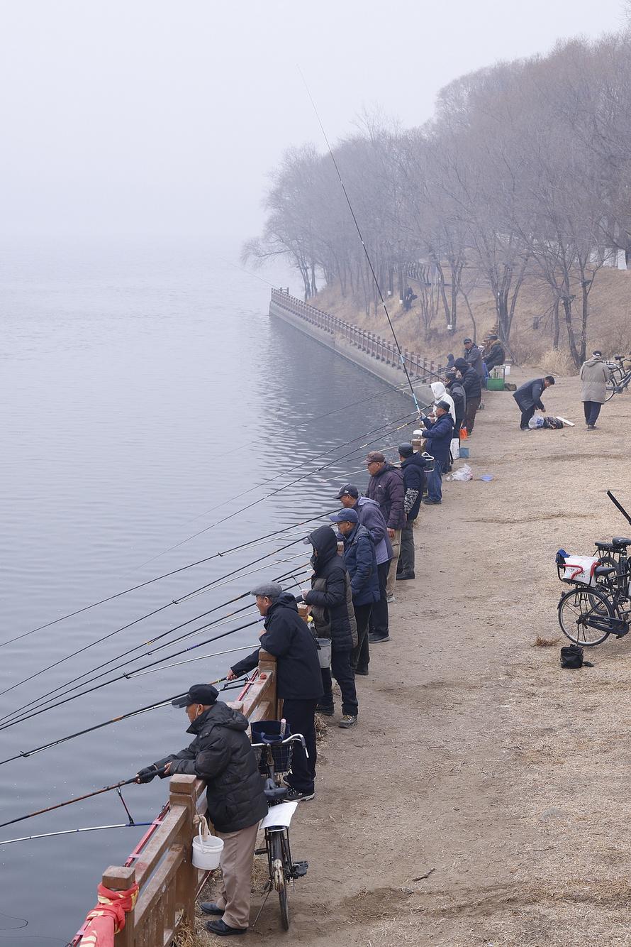 11月24日,辽宁沈阳,气温骤降至5℃左右,市民身着厚衣在岸边垂钓。