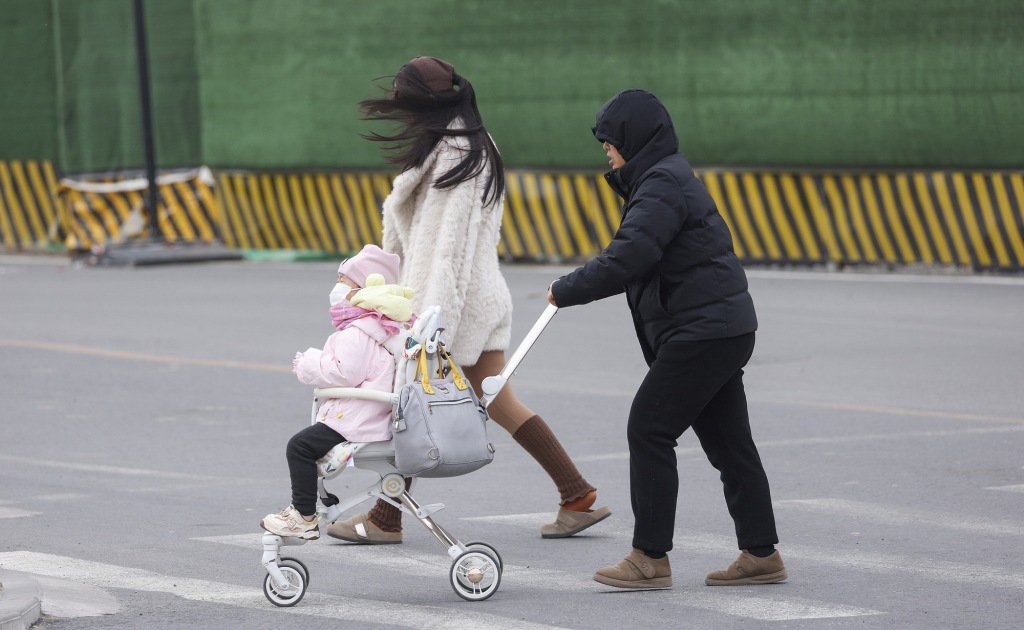 11月24日,家长带着孩子在风中出行。当日,北京迎来大风降温天气。