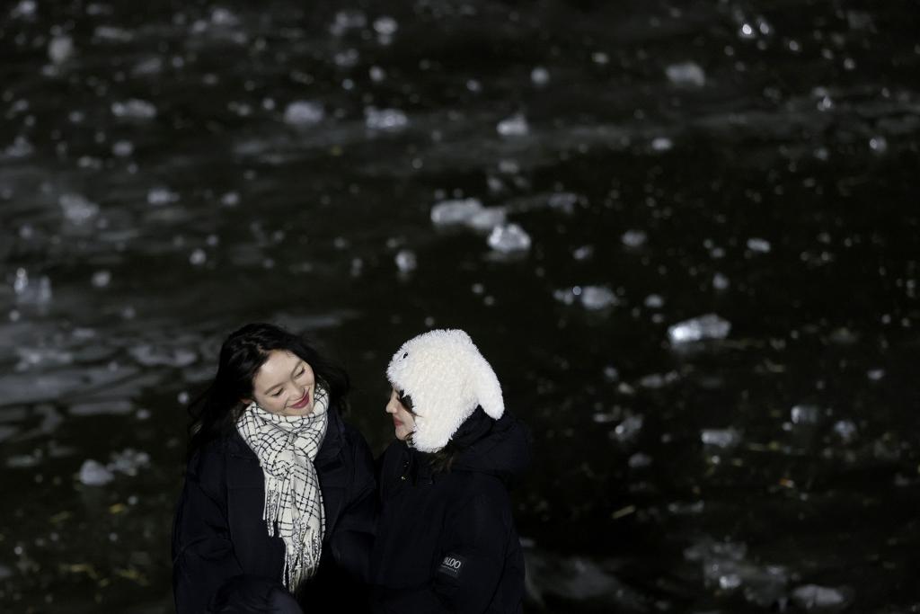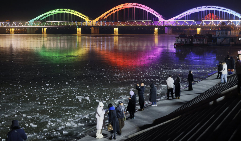 11月21日,黑龙江哈尔滨,冰城的严冬在松花江的冰封中悄然启幕。夜幕降临,游客们裹着厚厚的冬装,在江畔打卡。