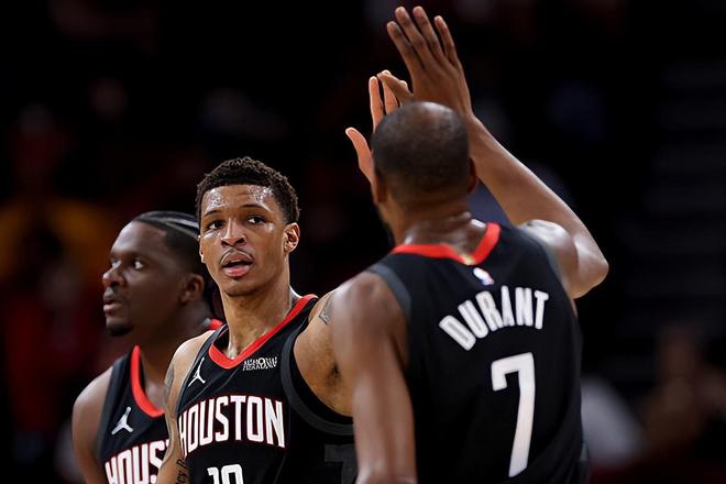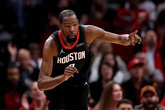 本场比赛中,火箭的先发小前锋凯文-杜兰特(Kevin Durant)的表现还是能够保持在一个比较理想的水平。杜兰特全场出场27分54秒,投篮13中8,三分线外5中2,罚球3中3,以稳定的效率得到了21分4篮板5助攻的数据,还有2次失误和3次犯规,正负值为+7。值得一提的是,27分54秒也是刷新了杜兰特本赛季的单场出场时间新低,在之前所有场次的比赛中,杜兰特的出场时间都是多于28分钟的。在出场时间不多的情况下,杜兰特也是抓住了机会展现出了自己超强的得分能力和稳定的投射能力,他在传球和策应方面也发挥出了一些自己的作用,他在防守端的表现也算是中规中矩。杜兰特在本场比赛中也是承担起了应该承担的责任,为球队的胜利做出了巨大的贡献。