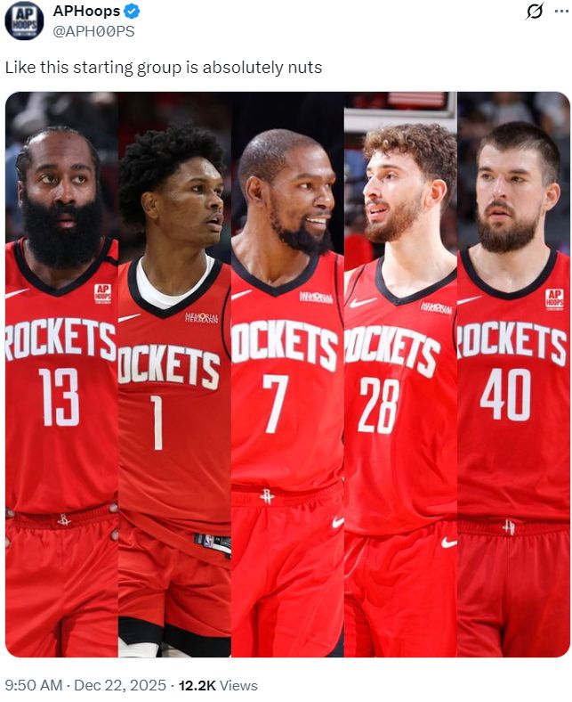 火箭先发可以变为哈登、阿门、杜兰特、申京、祖巴茨,这样申京不管是进攻、组织、防守压力都会大幅降低,祖巴茨也可以打替补小贾继续先发四号位,祖巴茨比海王年轻可以陪伴申京更长时间。