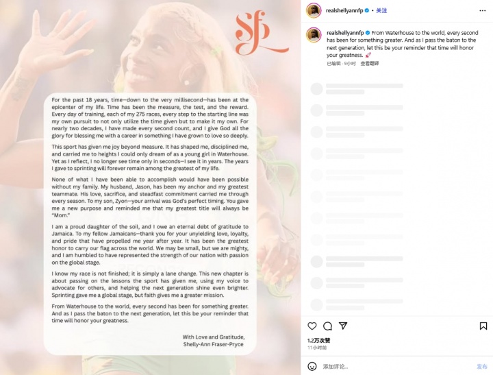 我是这片土地的骄傲女儿,对牙买加我永远心存感激。对于我的同胞们——感谢你们坚定不移的爱、忠诚和支持,这些年来一直推动着我前进。能够带着我们的国旗走遍世界,是我最大的荣幸。我们虽小但强大,能在全球舞台上代表国家的力量,我感到无比谦卑。