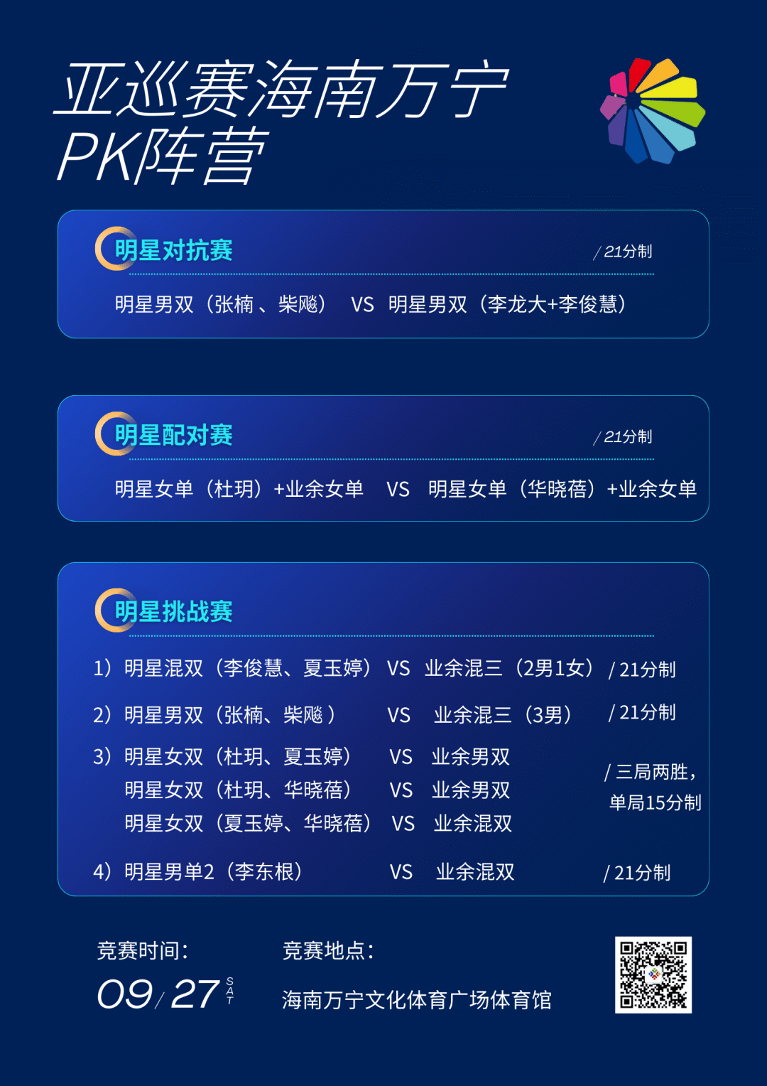 主办方资料显示,奥运冠军张楠、李龙大领衔着星光熠熠的赛事阵容,李俊慧、柴飚、杜玥、夏玉婷、华晓蓓、李东根等羽球名将共同集结万宁,为大家带来精彩的羽球盛宴。