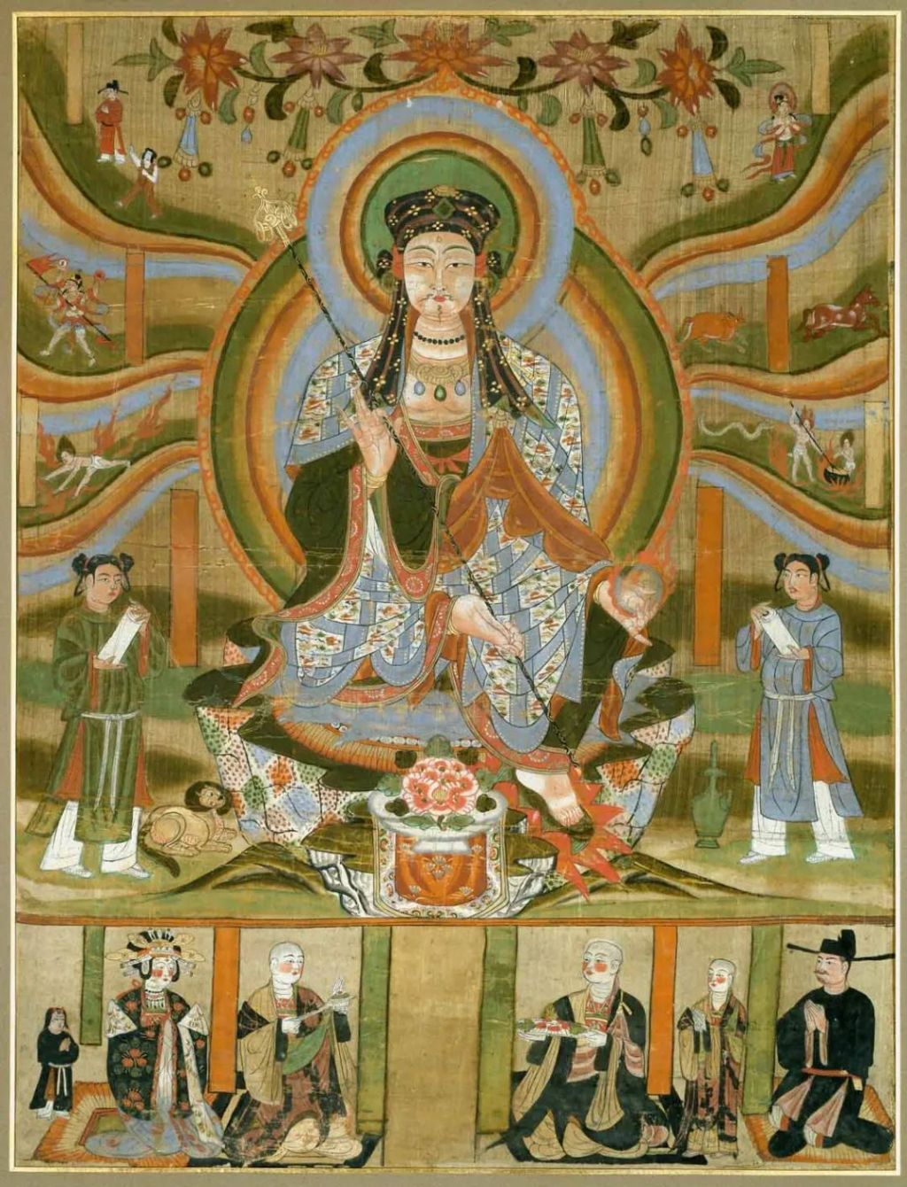 这张敦煌绢画右上角题着“南无地藏菩萨”,下有“忌日画施”四个小字,说明是为亡人设福超度所画。唐朝至五代时期,受佛教轮回思想的影响,“五道大神”在民间信仰中广为流传,即冥界神灵五道将军;“五道将军”与中国古代的泰山府君、佛教的阎罗王司职相近,专掌地狱、鬼卒等事。下方右侧画着一个服饰华丽的女供养人,跪在红色的地毯上,一手拿花,一手端香,后有二位女童,榜题“故大朝大于阗金玉国天公主李氏供养”。可知画像为于阗国王李圣天第三女——圣天公主,嫁给归义军节度使曹延禄,此时已卒,此为忌日施画。地藏信仰中,尤其强调家族后人为先人的资福修慧。