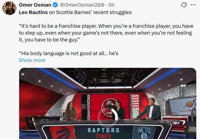 正如主持人Leo Rautins所说,巴恩斯作为猛龙队的箭头人物,他所展现出的问题恰恰是这支猛龙队目前整体状况的缩影。