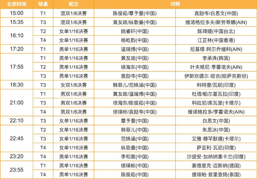 黄友政搭档纵歌曼,对阵俄罗斯组合,男双搭档温瑞博,值得期待,在不久前的多哈球星赛,他们打得决赛,差点拿到冠军,有希望成为国乒出色的男双组合,男单迎战韩国选手李承洙,相对陌生的选手。
