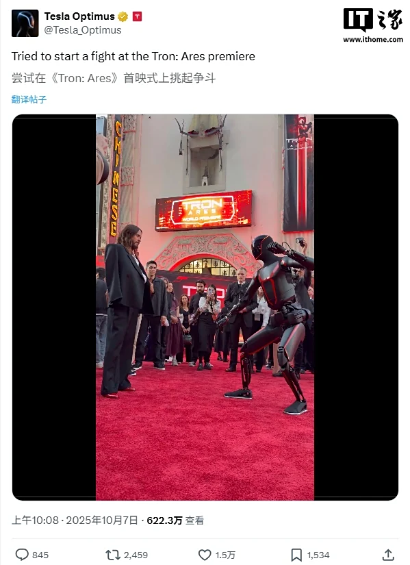 IT之家 10 月 7 日消息,特斯拉官方今日展示了旗下 Optimus 擎天柱人形机器人出席的《创:战神》首映礼的视频。