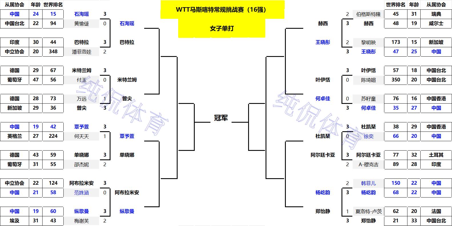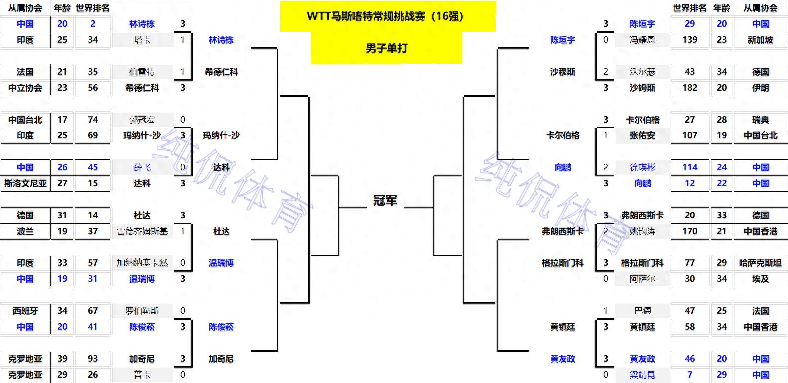 北京时间1月22日凌晨,2026年WTT马斯喀特常规挑战赛结束了第3个比赛日的争夺,目前单打16强正式出炉(签表详情见如下图表)!国乒单打一共27人参赛,已有15人输球出局,其中男单二号种子梁靖崑爆冷输球,遭遇一轮游,下面带来详细信息。
