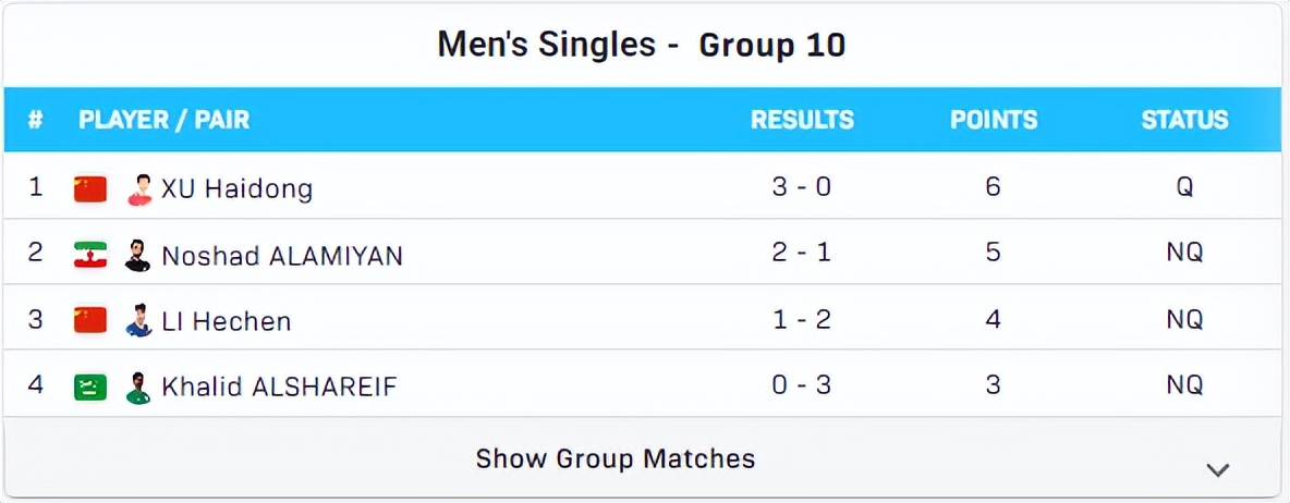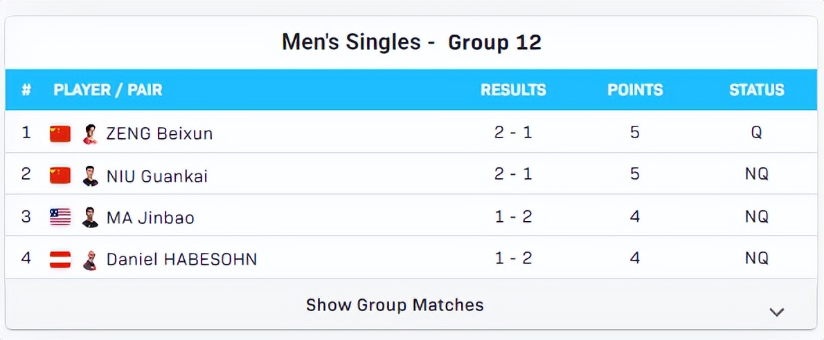 曾蓓勋同样2胜1负(3-1马金宝;2-3哈贝松;3-1牛冠凯),牛冠凯与曾蓓勋二人一样,计算小分曾蓓勋晋级,牛冠凯被淘汰出局。