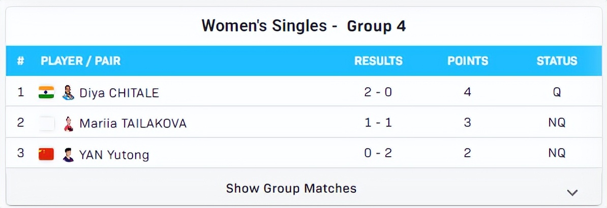 闫禹橦在女单资格赛小组赛就没有出线,小组赛两战皆负(首战1-3不敌中立协会球员泰拉科娃;第二站1-3不敌印度选手奇塔莱),小组赛垫底出局。