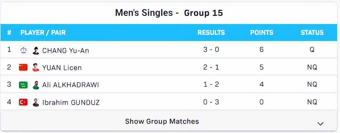 结果袁励岑小组赛2胜1负(3-1阿里;3-0贡杜兹(退赛);1-3张佑安)位列小组第二遗憾出局,中国台北选手张佑安小组赛三战全胜小组第一出线。