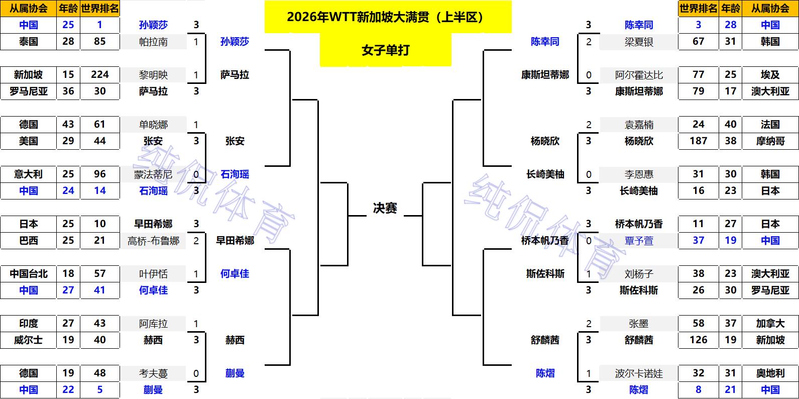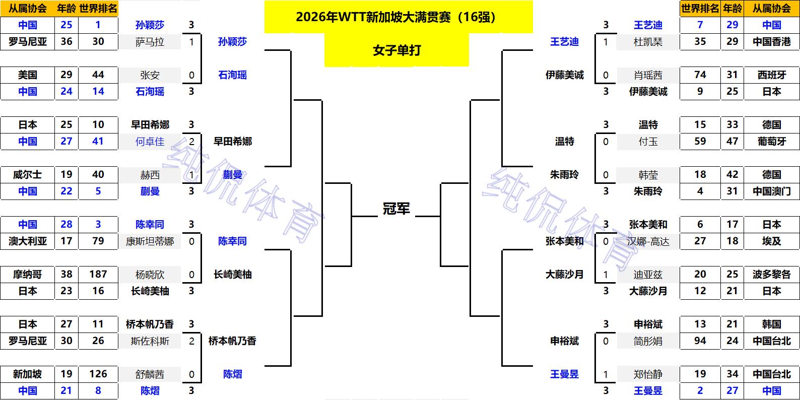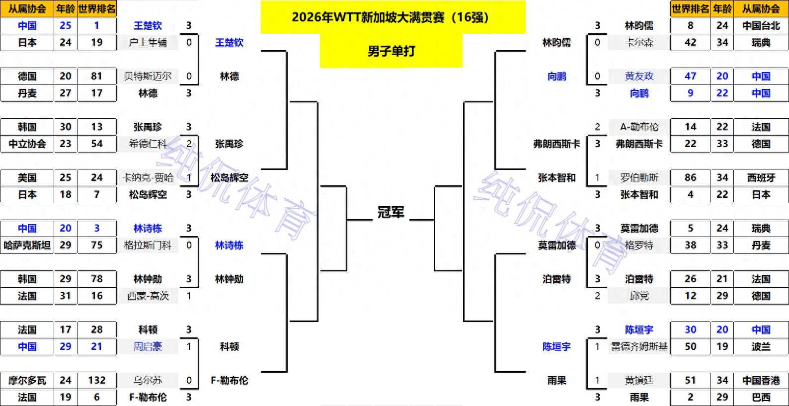 北京时间2月25日晚,2026年WTT新加坡大满贯赛结束了正赛第4天的争夺,目前单打16强正式出炉!本人详细整理了对阵签表,如下图所示。国乒单打17人已有6人出局;日乒单打13人有8人晋级;韩国单打一共14人仅剩下3人,下面带来详细信息。