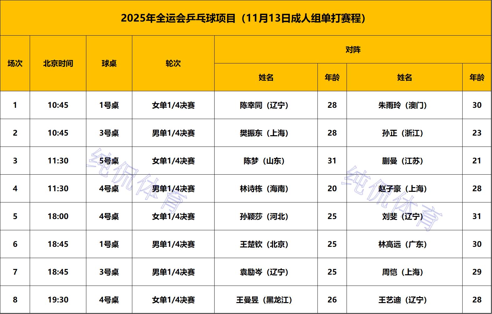 根据赛程安排,在北京时间11月13日,乒乓球成人组将进行单打1/4决赛,诞生男、女单四强名额!具体赛程安排见如下图表,樊振东和陈幸同率先打响男、女单四强战;
