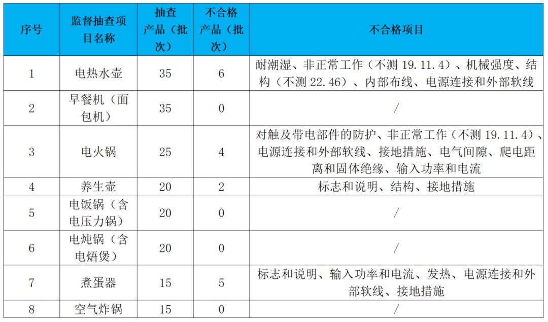 市市场监管局介绍,近期对本市生产、销售的厨房家用电器产品质量开展监督抽查,具体包括电热水壶、早餐机(面包机)、电火锅、养生壶、电饭锅(含电压力锅)、电炖锅(含电焐煲)、煮蛋器、空气炸锅等8类,共抽查产品185批次。经检验,发现不合格产品17批次。不合格项目涉及电源连接和外部软线、非正常工作、接地措施、标志和说明等。详见↓