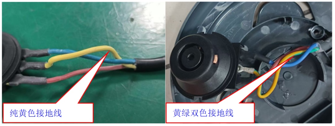 (1)I类器具的电源线中接地线为纯黄色线,非标准规定的黄绿双色线。可能导致更换电源线时错误接线,进而引发人员触电事故。