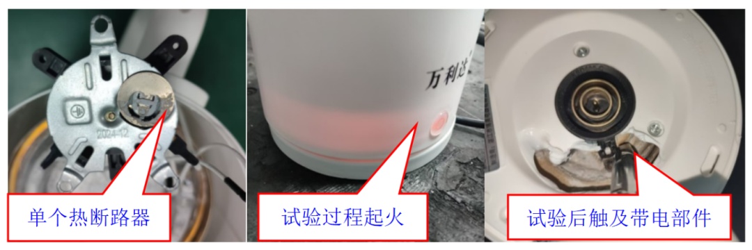 发现的问题主要是器具只装有一个热断路器,且该热断路器与限温器均位于电热元件的同一极性侧。依据标准进行热断路器旁路试验,器具起火,试验后B型试验探棒可触及带电部件。存在引发火灾、触电等安全隐患。