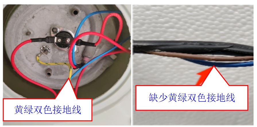 发现的问题主要是器具内部(底座)安装了黄绿双色接地线,但电源软线中却缺少对应的黄绿双色接地线,导致接地措施无效。当用户触碰到可能带电的金属部件(例如插座或外部金属壳)时,电流无法通过接地线导入大地,极易引发触电伤害,直接威胁人身安全。