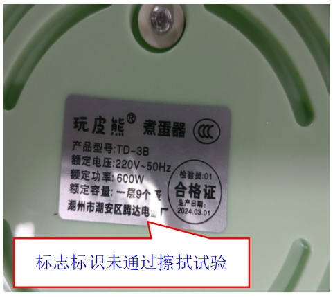 发现的问题主要是器具标注的信息有误或不全、未通过擦拭试验。易造成使用者误操作,如果无法识别正确的额定电压、功率标识等,可能因适配错误电路导致过载起火。