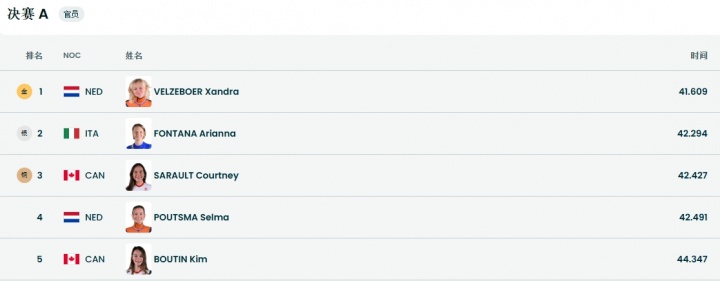 冬奥会短道速滑女子500米决赛,荷兰选手桑德拉·贝尔塞伯41秒609夺得金牌。范可新在B组决赛中最终收获第10名。