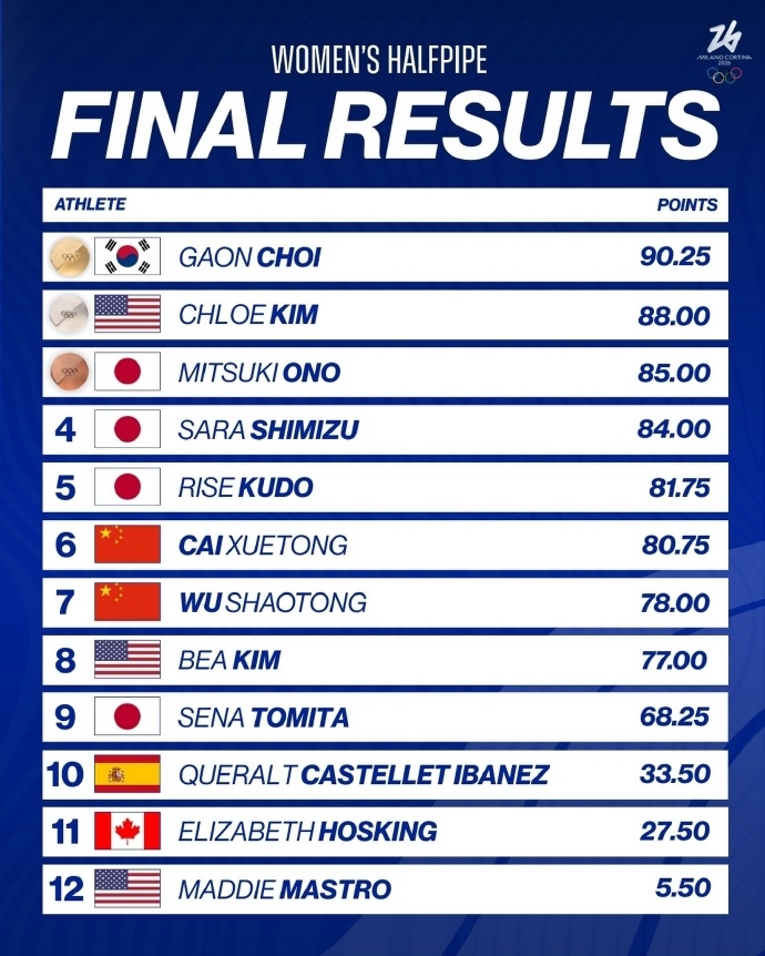 冬奥会女子单板滑雪U型场地技巧决赛,蔡雪桐80.75分获第六名,武绍桐78.00分获第7名。