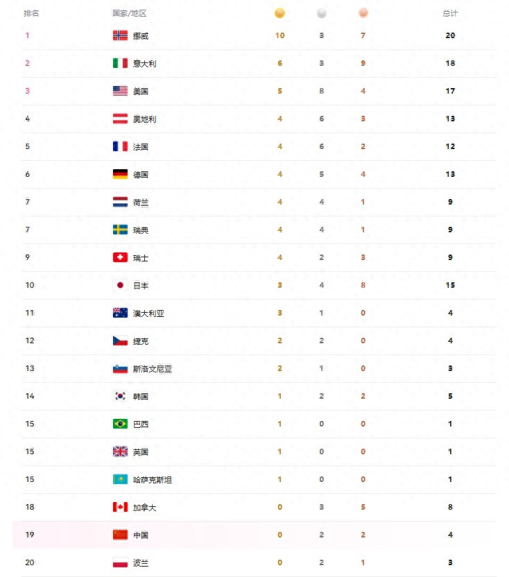 美国5金8银4铜继续第三,奥地利4金6银3铜上升到第四。中国队又没有奖牌入账,两个冲金项目都失利,金牌榜继续下跌到第19位。