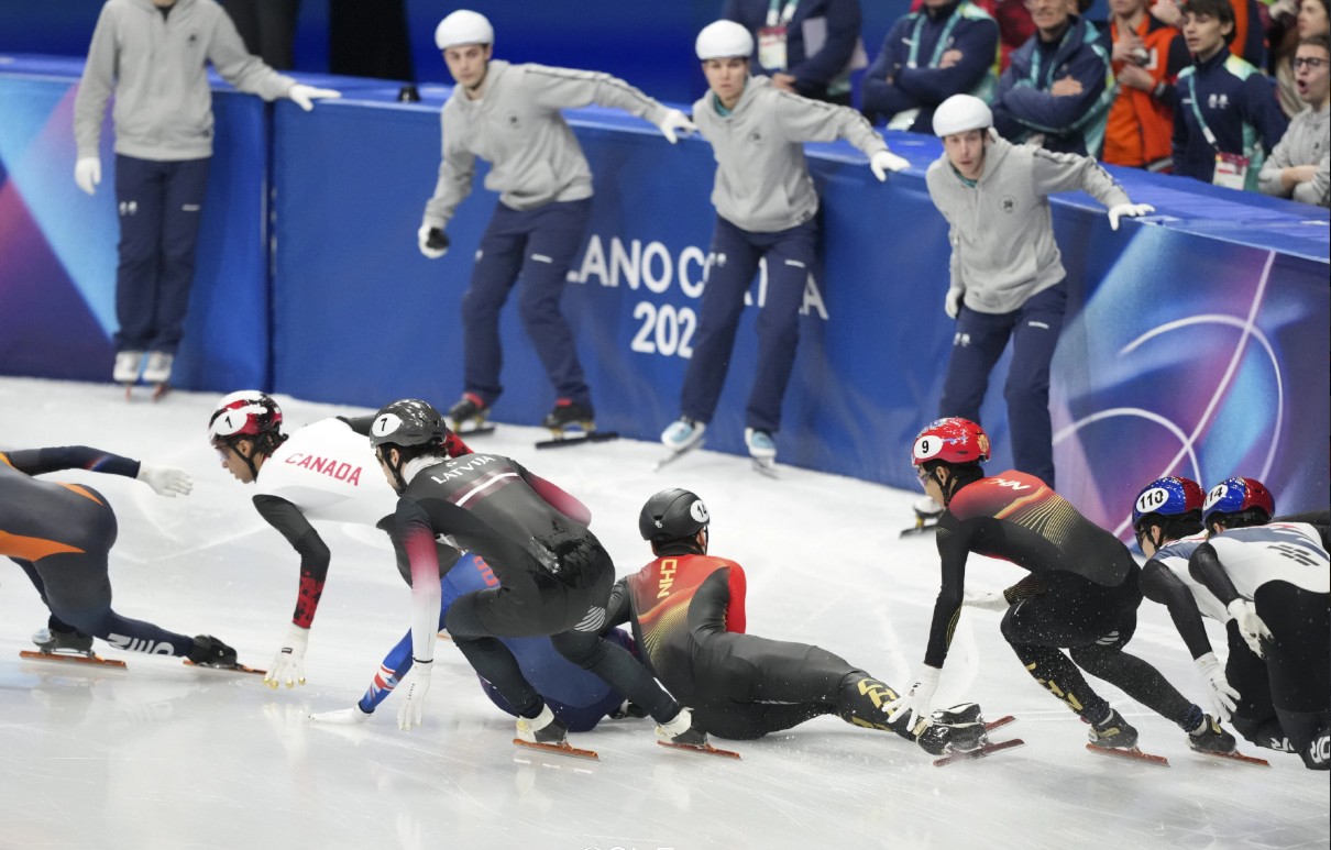 因半决赛多组选手被判犯规晋级,A组决赛罕见出现9人同场竞技的超额阵容,赛道拥挤大幅增加碰撞风险,被解说称为"冰上混战"。
