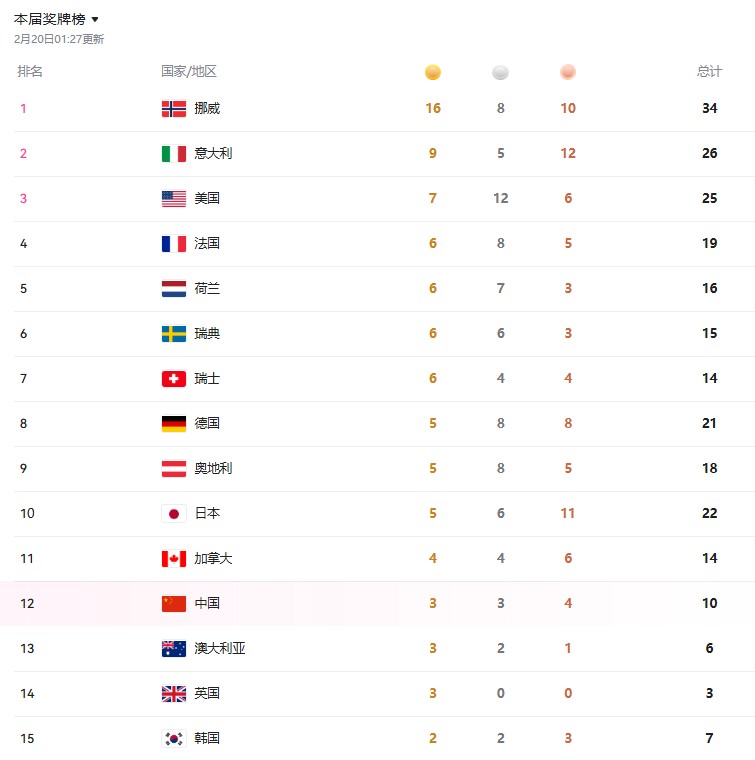 截至2月20日,中国队以 3金3银4铜 暂列奖牌榜第12位: