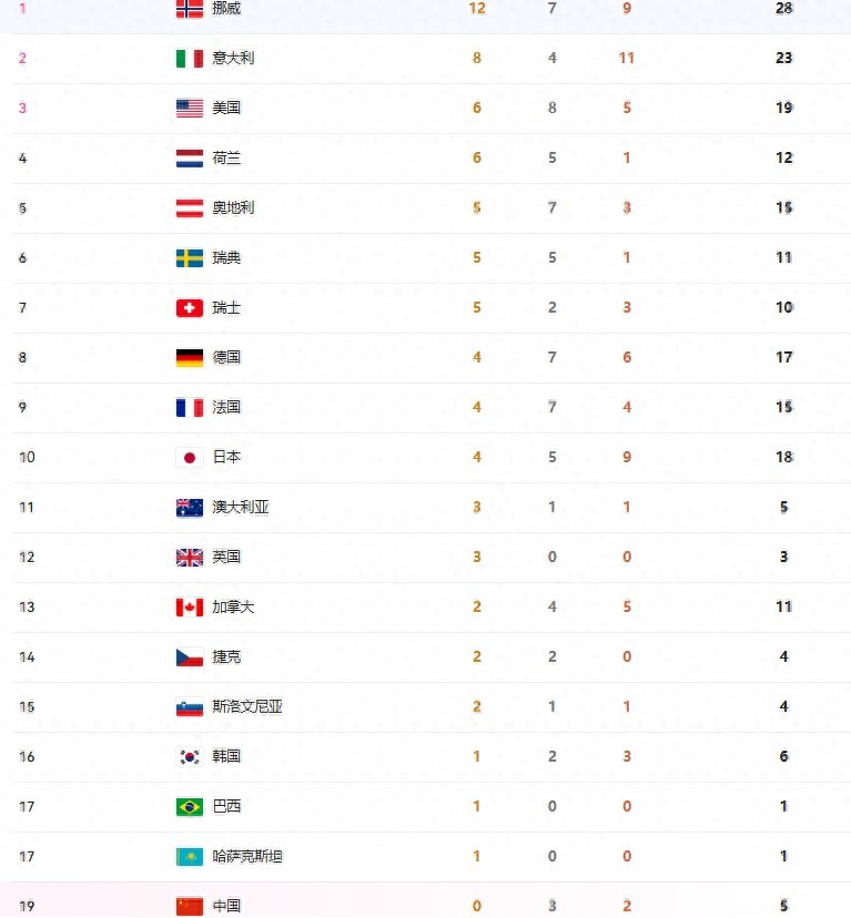 一共116枚金牌已经产生74枚,目前榜首依然还是挪威,12金7银9铜,28枚奖牌也是最高,东道主意大利继续位列第二,8金4银11铜23枚奖牌。