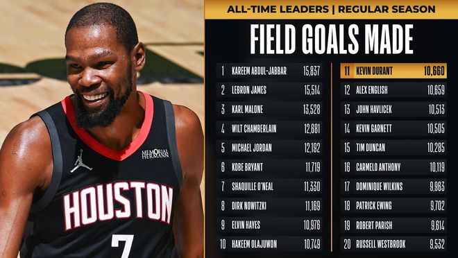 杜兰特首节中投命中,投进生涯第10660个进球,这也让他超越英格利什,升至NBA历史进球榜的第11位。位居第10的是火箭名宿奥拉朱旺(10749球)。