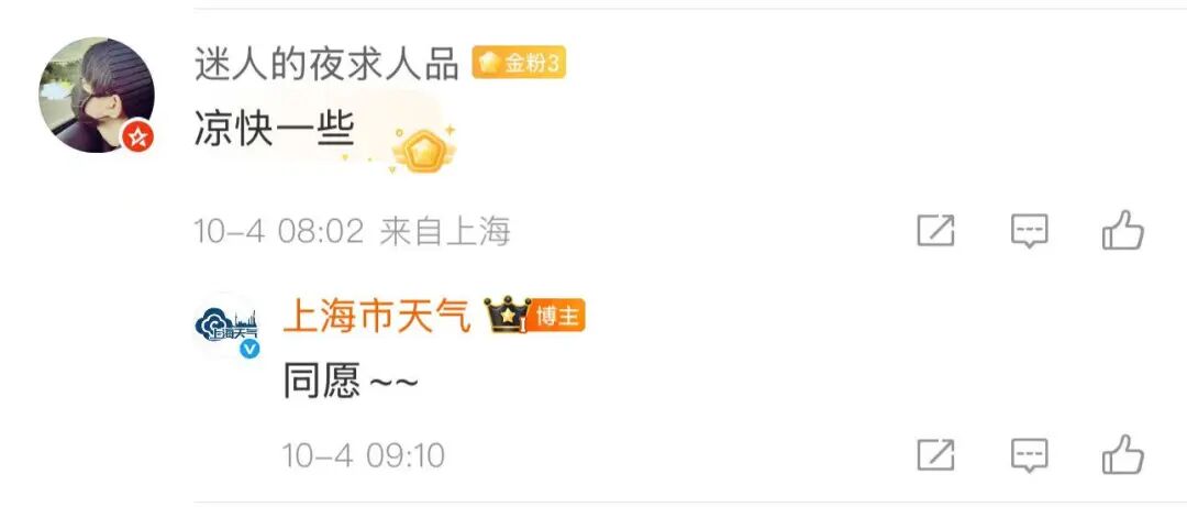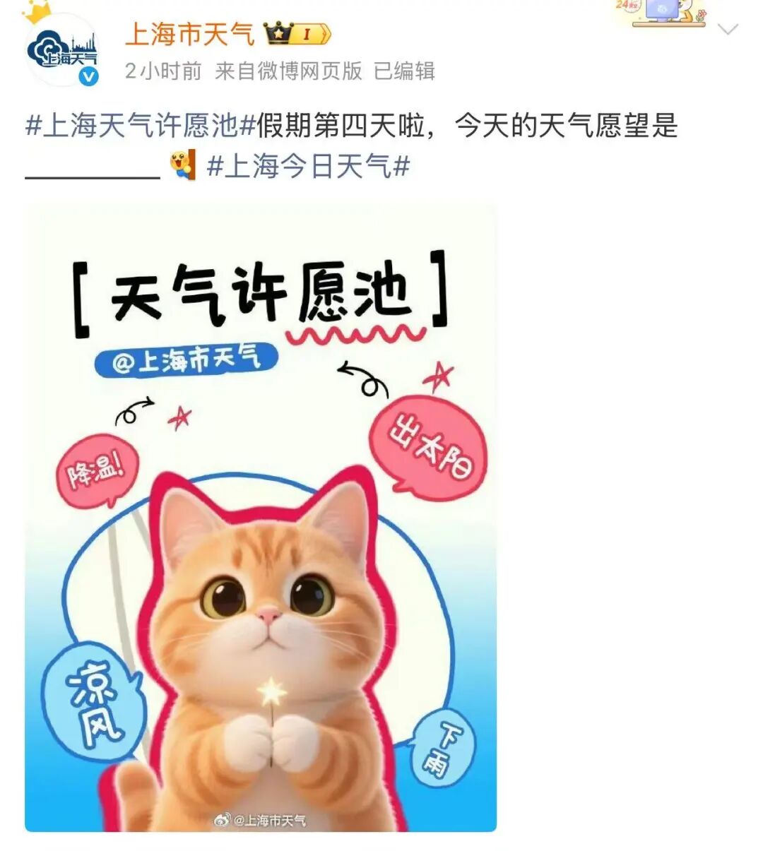 不过台风对于上海的影响基本无,高温暂时也不会终结,就连官方@上海市天气今天也下场变许愿池“今天的天气愿望是______”。