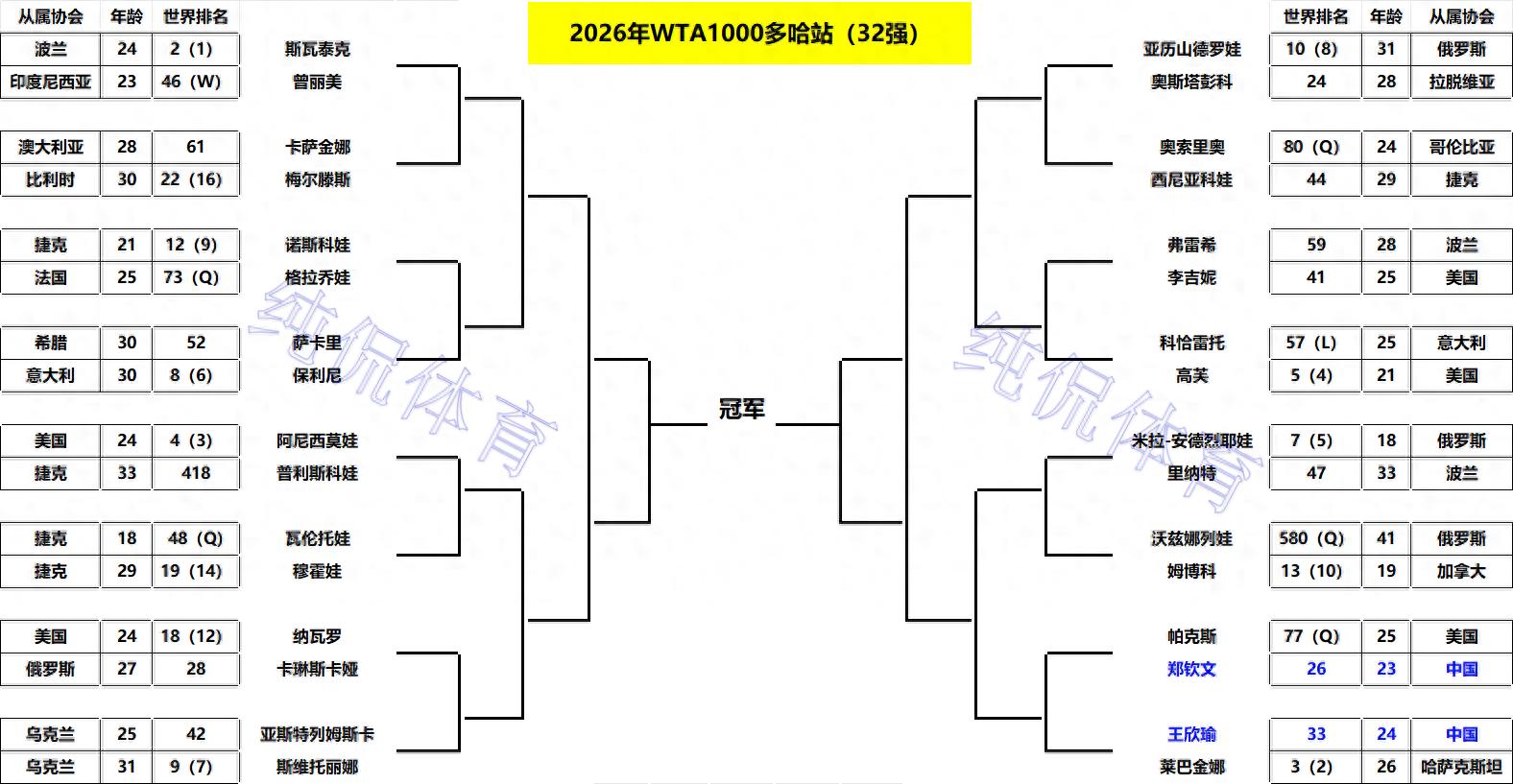 北京时间2月10日凌晨,2026年WTA1000赛多哈站结束了正赛第2个天的争夺,32强正式出炉(详情见如下图表)!两名中国球员郑钦文、王欣瑜全部取胜!北京时间2月10日晚,郑钦文和王欣瑜将全力冲击16强,下面带来详细信息。
