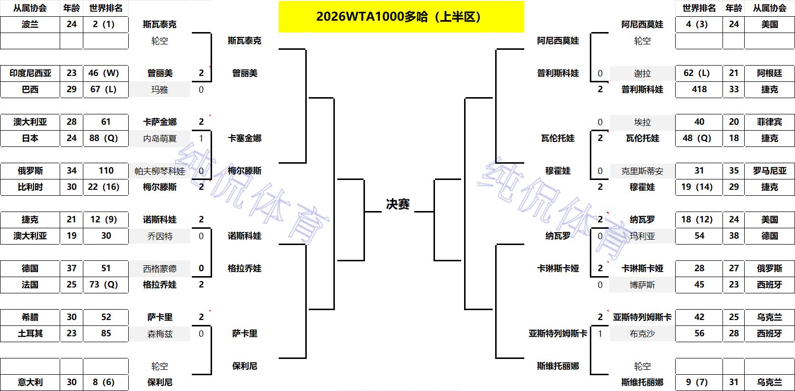2026年WTA1000多哈站32强