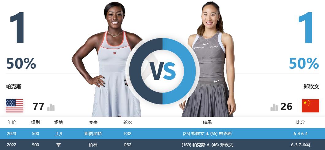 郑钦文与帕克斯二人此前一共有过2次交手记录,双方各胜1场平分秋色,不过二人最近的一场比赛还要追溯到2023年,当时郑钦文取得了胜利,由于时间已经过去两年多了,并不具有很好的参考价值,郑钦文想要取胜还是要做好自己。