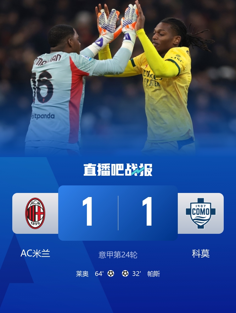 距榜首7分 米兰1-1科莫24轮不败 莱奥吊射迈尼昂送礼阿莱格里染红