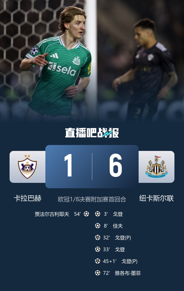 欧冠联赛淘汰赛附加赛首回合,纽卡斯尔联6-1大胜卡拉巴赫,戈登大四喜。