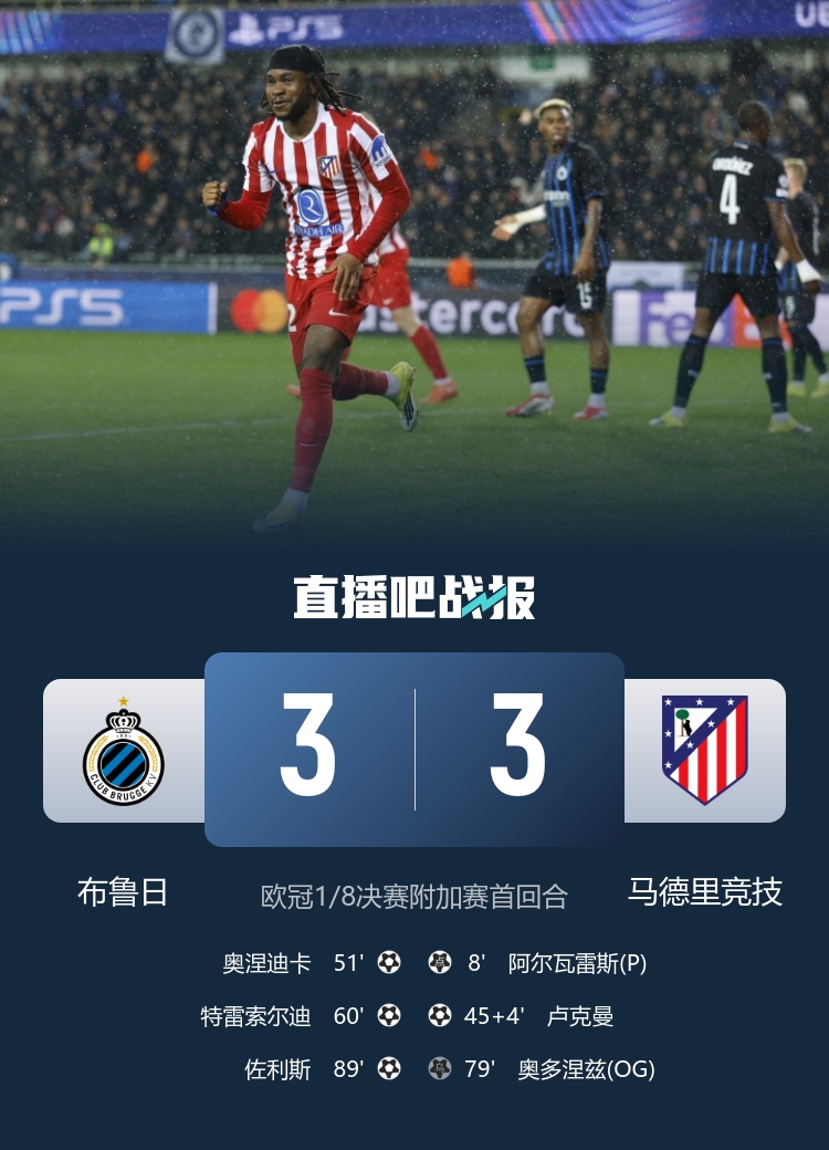欧冠1/8决赛附加赛首回合,马竞3-3遭布鲁日绝平,阿尔瓦雷斯、卢克曼进球。