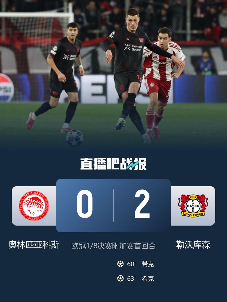 欧冠1/8决赛附加赛首回合,希克梅开二度,勒沃库森2-0奥林匹亚科斯。