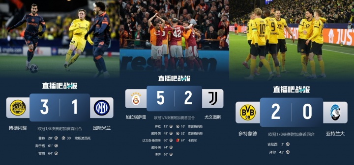 欧冠淘汰赛附加赛首回合,国米1-3博德闪耀,尤文2-5惨败给加拉塔萨雷,亚特兰大0-2不敌多特蒙德。