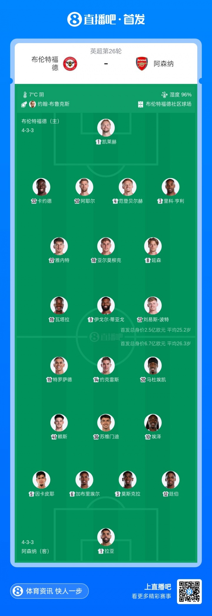 直播吧2月13日讯 北京时间2月13日4:00,英超第26轮,布伦特福德vs阿森纳。赛前双方公布了本场比赛的首发名单。【阿森纳方面,哈弗茨、梅里诺等球员因伤无缘大名单,萨利巴也因病缺席了本场比赛。埃泽、莫斯克拉此役为枪手先发。】