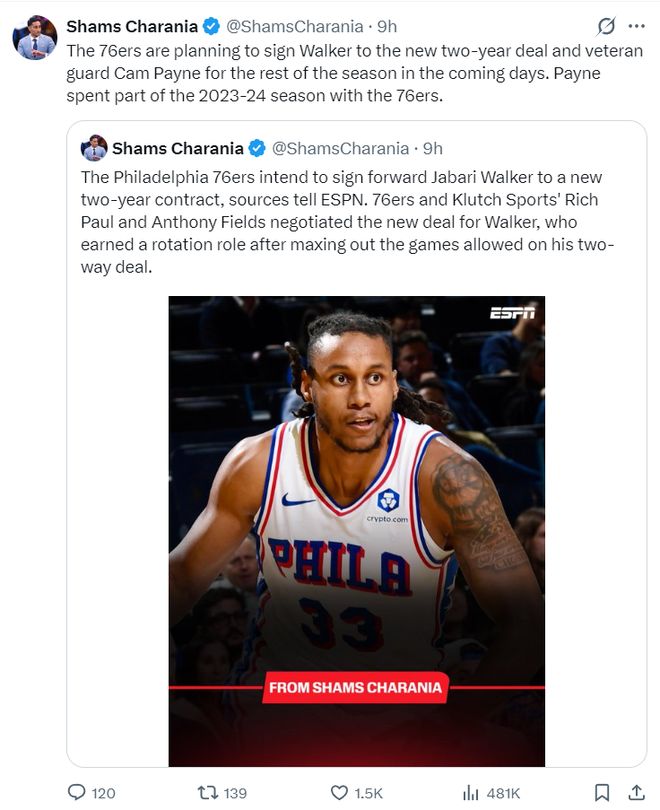 除此之外,费城计划在未来日年后与前NBA后卫卡梅隆-佩恩续约至赛季结束,佩恩曾在23-24赛季曾为费城效力过一段时间。