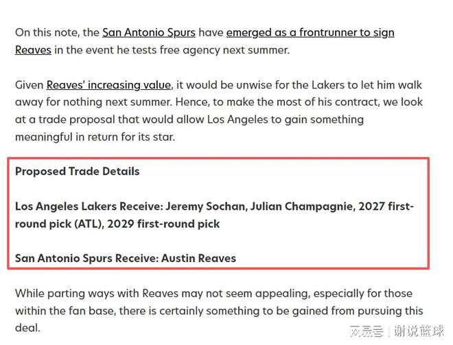 因此媒体FW就脑洞大开,支招湖人跟马刺交易,可以尝试送里夫斯去圣城。而从具体方案来看,湖人得到的回报也相当不错,除了换两将杰里米-索汉和尚帕尼外,还加上未来首轮签作为回报。