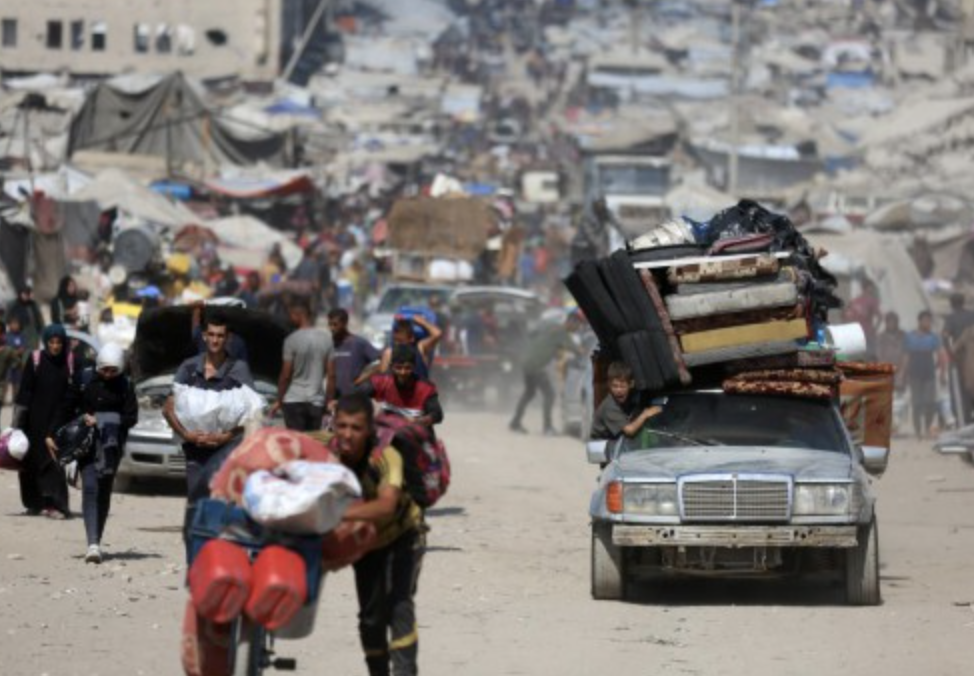 9月18日,在加沙城以西的沿海公路上,人们运载着生活用品,汇入人潮向南撤离。图据新华社