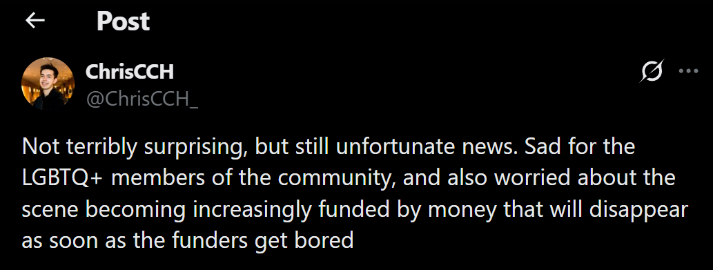 美国格斗电竞解说员Stephen Lyon( Sajam)公开表示,在这次收购之后,属于格斗游戏粉丝的那些东西正在不断减少。曾经因为与沙特的价值观差异问题拒绝参加电竞世界杯的美国职业选手Christopher Hancock(ChrisCCH)则表示,他替那些少数群体感到悲哀,格斗电竞不能依赖那些一旦捐助者失去兴趣就会消失的资金。