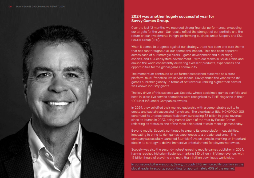 根据沙特Savvy Games Group 公布的2024年年报,这家公司已经「拥有全球电竞行业的40%」。如果你不是沙特人,那么这绝对是一个足以令你胆寒的数字。