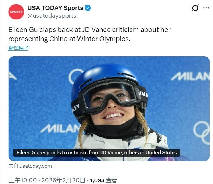 此前在接受福克斯新闻采访时,美国副总统万斯在提到谷爱凌时表示,他希望那些在美国长大的人“会想着代表美国参赛”。