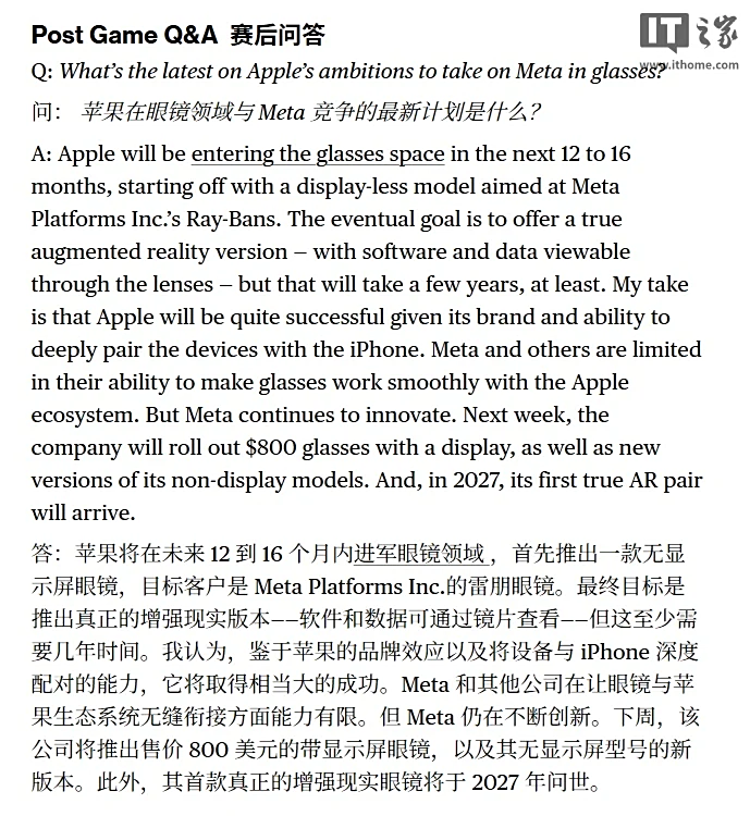 此外,苹果具备将硬件深度融入自身生态系统的能力。Meta 等竞争对手在让其智能眼镜与 iPhone 兼容时面临诸多困难,而苹果则可像对待其他产品一样,实现智能眼镜与 iPhone 的深度整合。